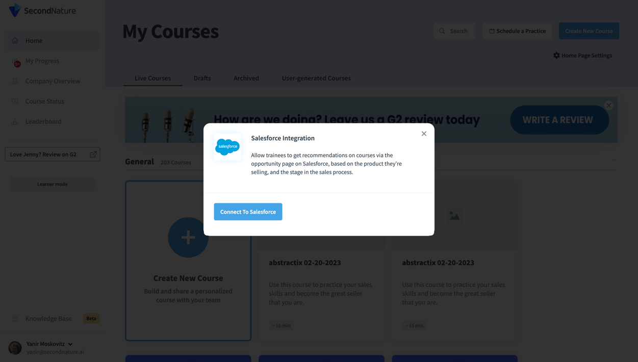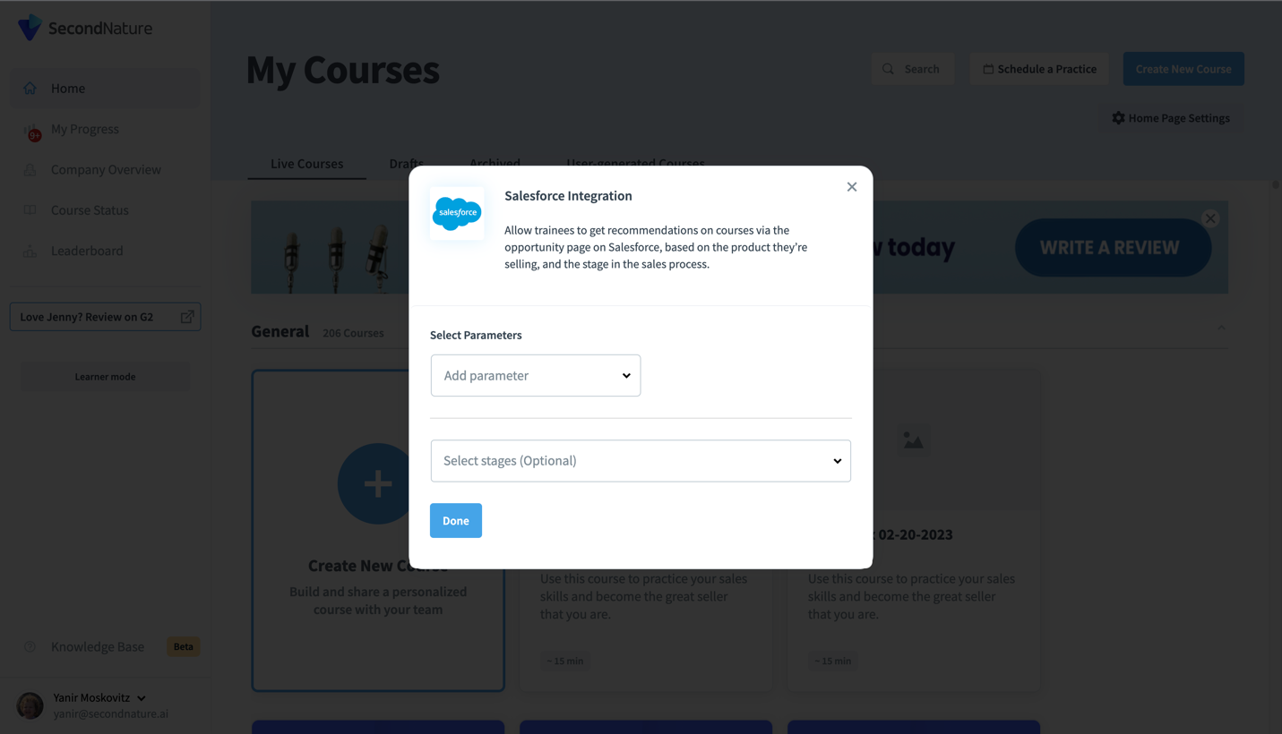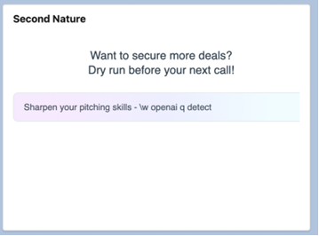 Integrating your Second Nature account into Salesforce allows for personalized training experience that helps reps enhance their sales potential, enabling them to practice and refine their skills ahead of real sales interactions.