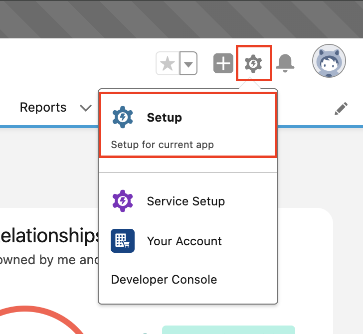 1. Login to your company’s Salesforce account using a user that has admin privileges. Click the cog icon and then Setup.