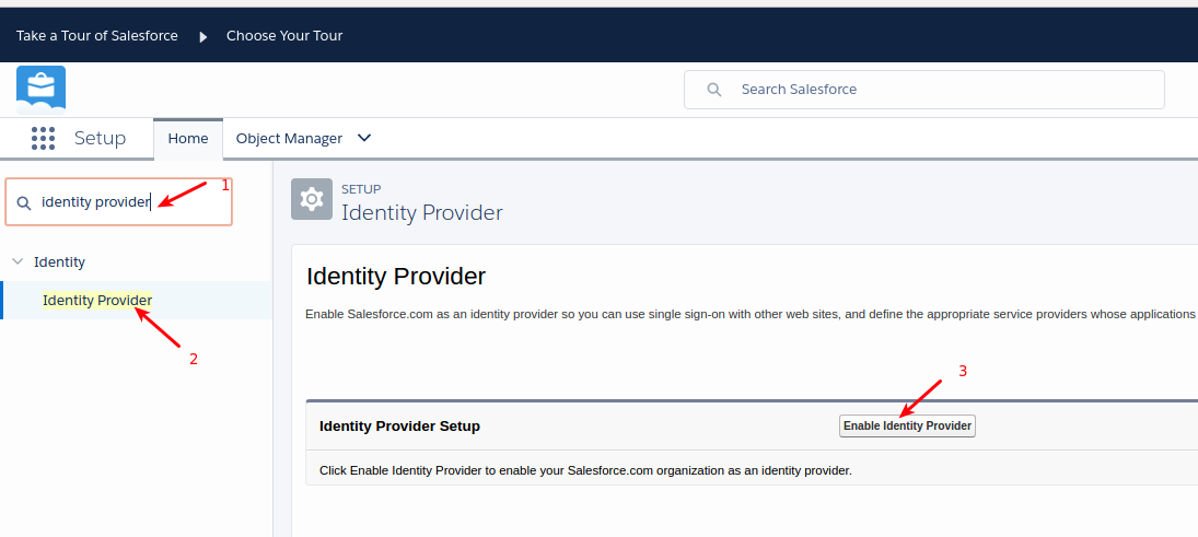 1. In Quick Find, enter Identity, then select Identity Provider from the result