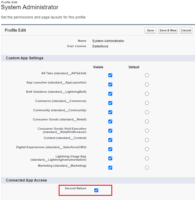 9. In the Connected App Access section, check the Second Nature App