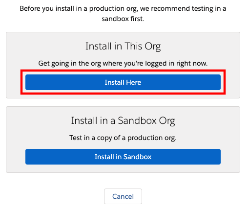 6. You should see a screen with installation options. Under “Install in this Org” select Install Here.