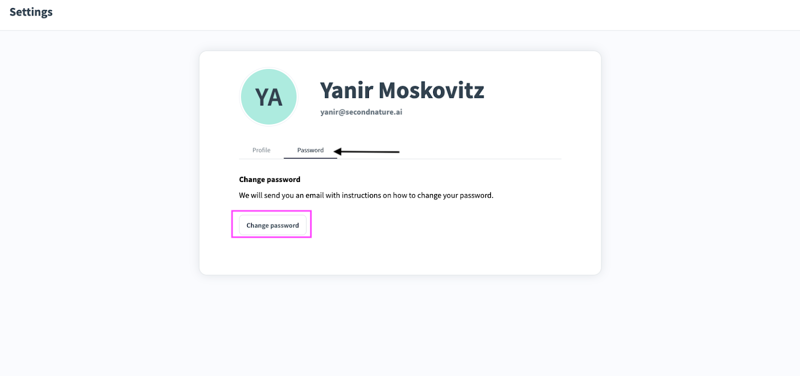 The Password tab includes the Change Password button [Pink rectangle above]. Once the user clicks on Change Password a link will be sent to their email address.