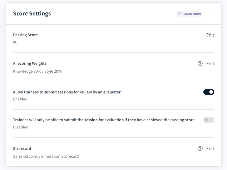 When setting up a role play, there is an option to make the role plays/sessions eligible for manual evaluation. By default, this setting is disabled. In the Score Settings section, toggle the setting Allow trainees to submit sessions for review by an evaluator on. After creating the course, users should be assigned as course evaluators.