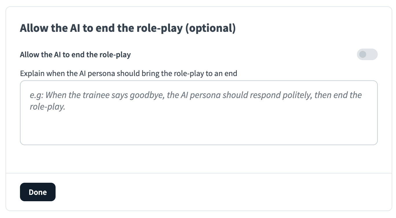 When enabled, you must provide clear instructions in the editor describing when and under what conditions the AI should bring the simulation to an end (e.g., after a successful booking, after all required questions are asked, or when the conversation reaches a natural conclusion).