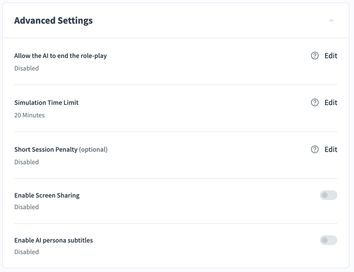 By default, AI persona subtitles are turned off. Toggle this option if you want subtitles (captions) to appear for the AI persona during the simulation.