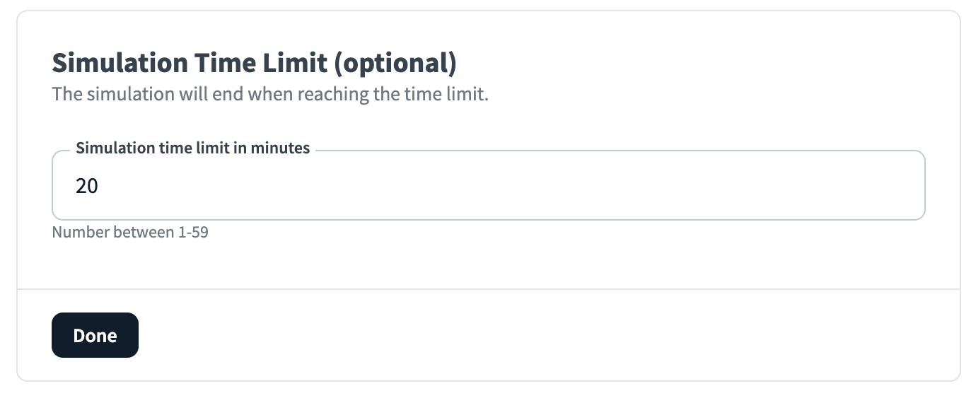 By default, the simulation time limit is set to 20 minutes. You may adjust the maximum time for a simulation to any duration between 1–30 minutes.