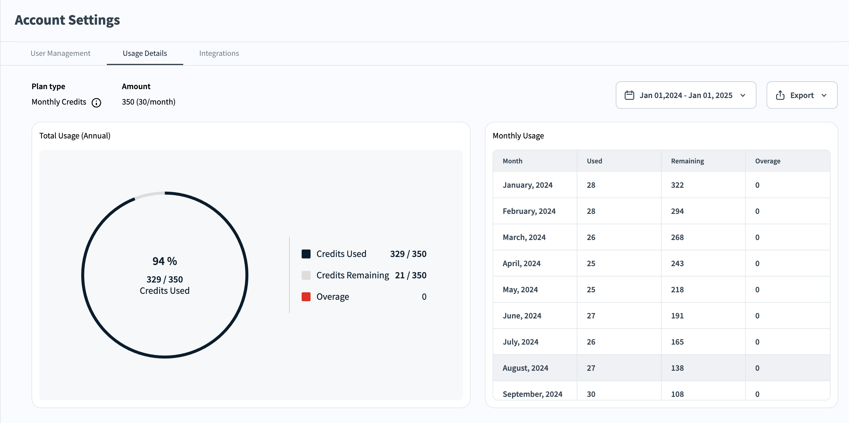 Account Settings - Usage Details tab