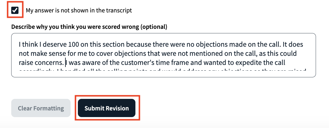 a. If the transcript of the role play contains text that addresses the topic, but the AI Analysis missed the relevant text, click to highlight the relevant text. After you highlight text from the transcript that is relevant to the topic being assessed, you may enter the reason the text is relevant in the textbox provided, labeled “Describe why you think you were scored wrong.”