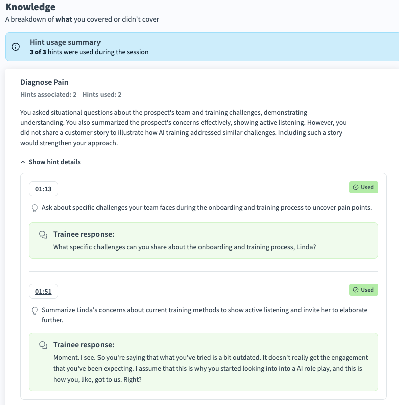 In-Session Hints provide real-time guidance during practice sessions, helping trainees stay on track based on the conversation so far.