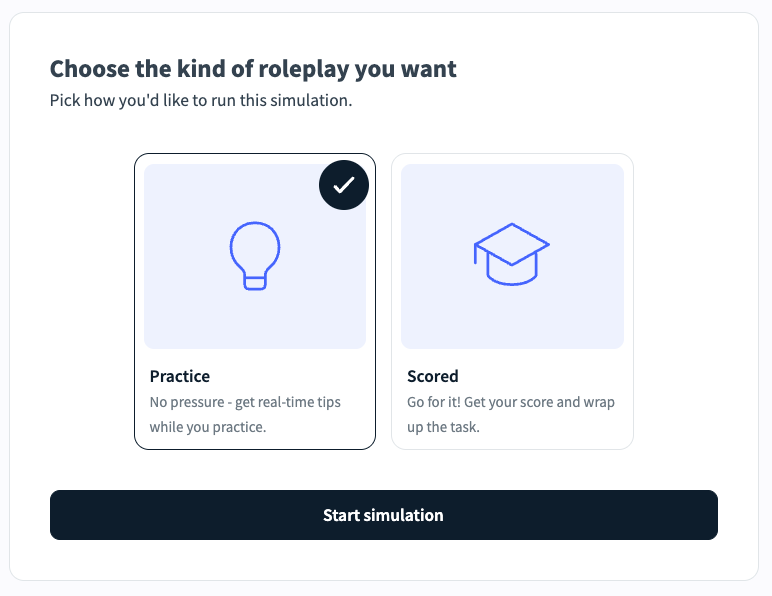 When Practice Mode is available, trainees choose between Practice and Scored each time they start a role-play.