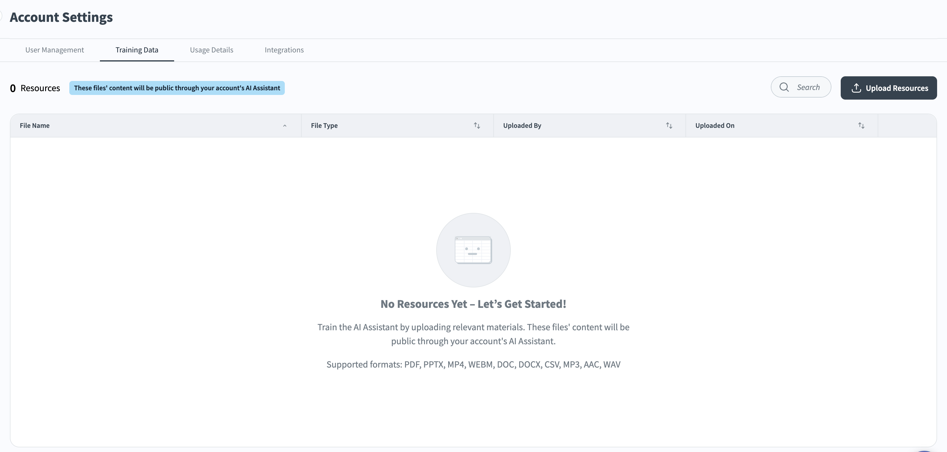 Click 'Upload Resources' and select the files you wish to upload. You can upload a combination of files (up to 20 files) in formats such as pptx, pdf, txt, csv, mp4, wav, and webm.