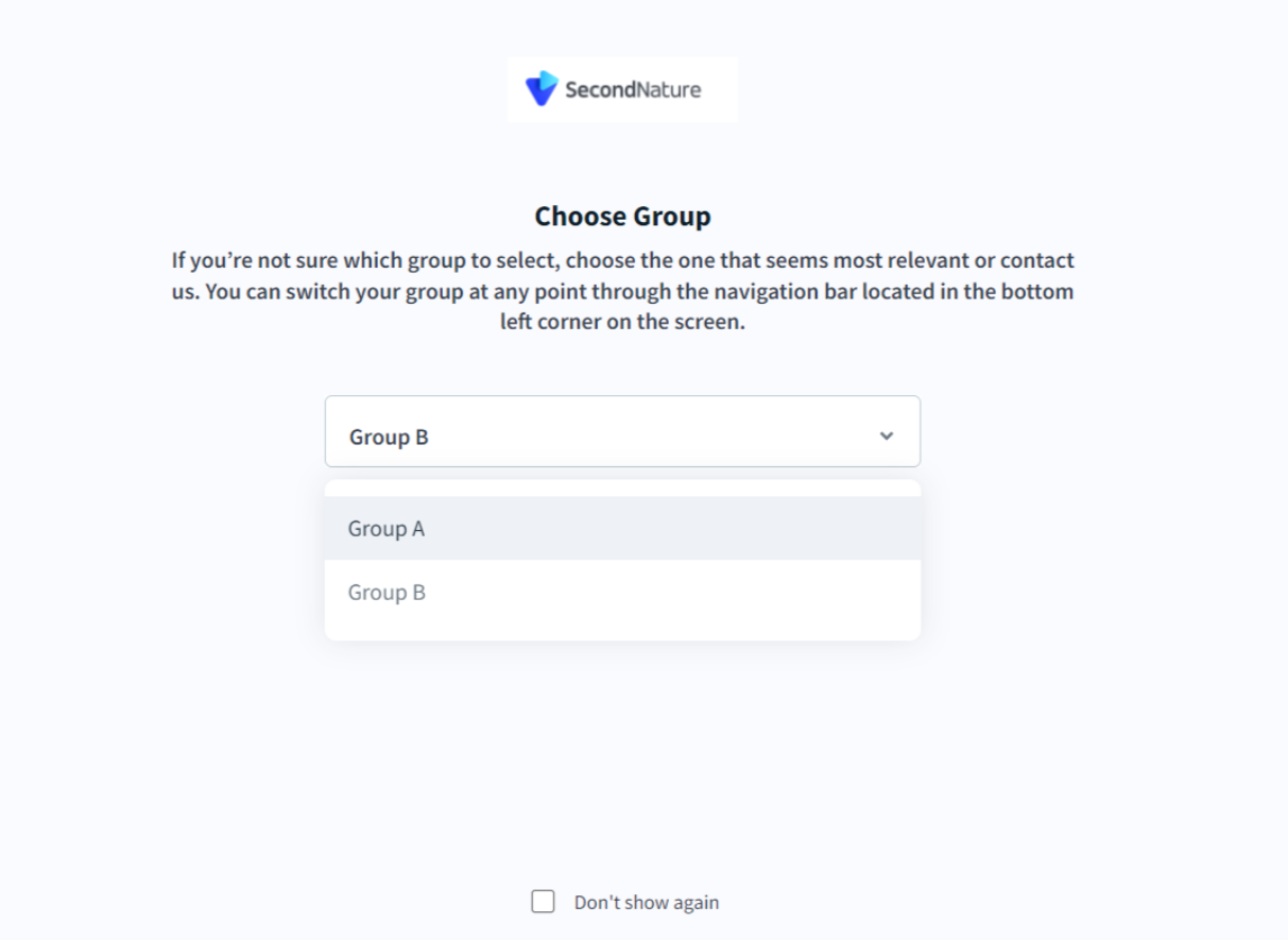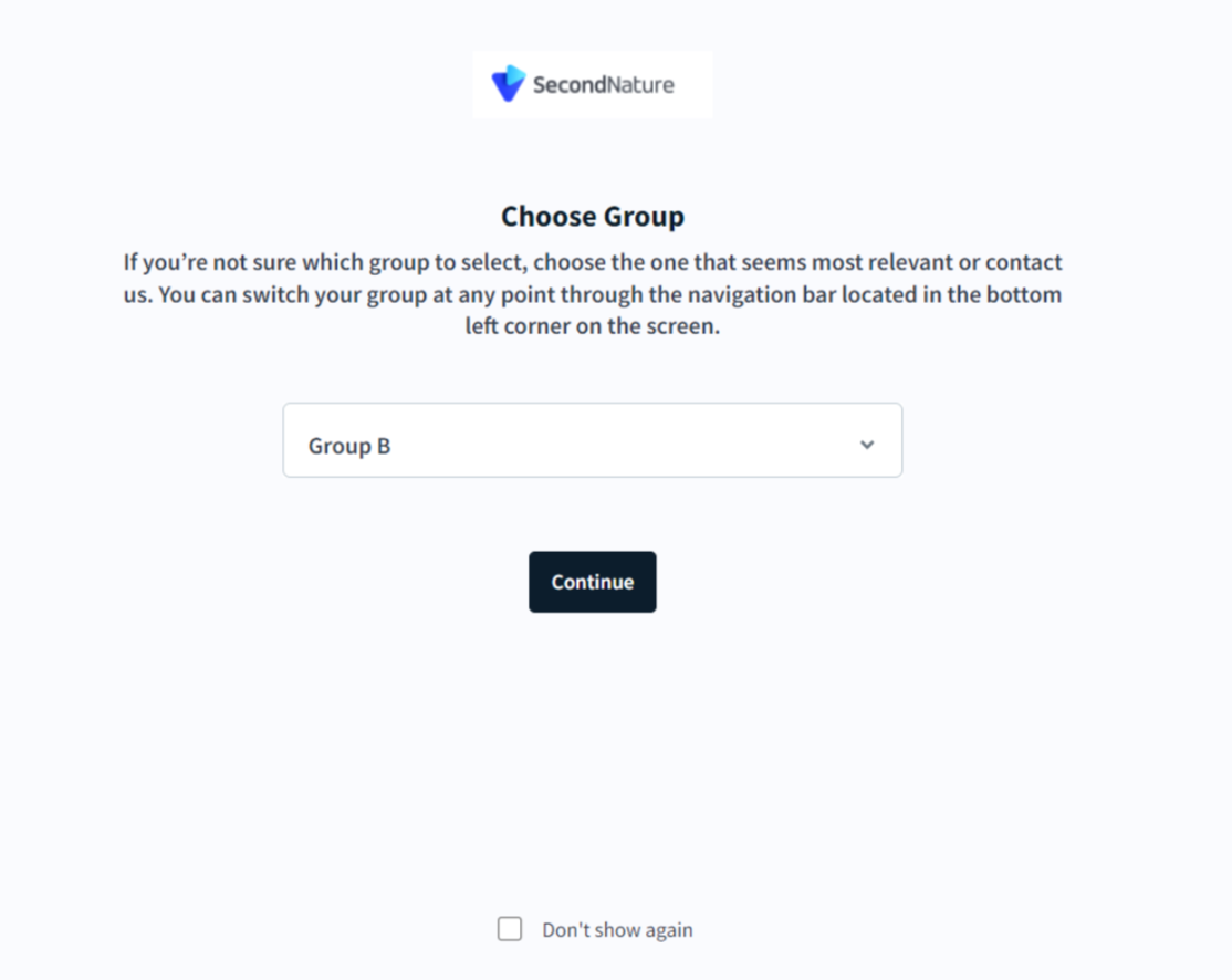 When first logging in to second Nature, trainees can decide which group they belong to.