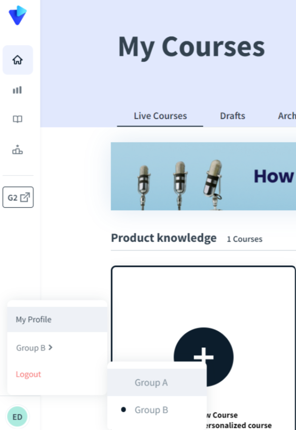 Trainees can switch their current group by going to the bottom left menu in the Second Nature app homepage, clicking it, and selecting the relevant group they want to belong to.