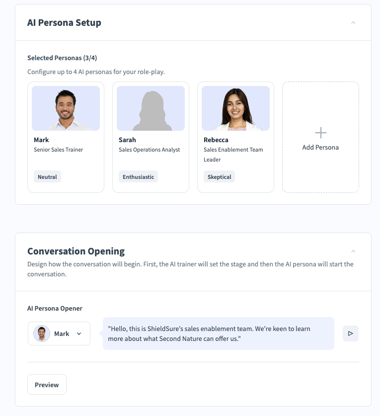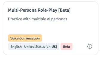 The Multi-Persona Role-Play feature allows trainees to practice complex, realistic conversations involving multiple AI personas within a single simulation. This enables richer training scenarios that mirror real-world environments, such as group discussions, multi-stakeholder sales calls, or customer interactions involving more than one representative.