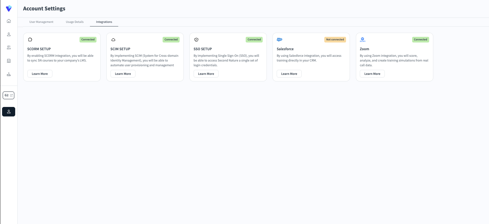 Second Nature offers users with admin permissions visibility into the various integrations we support. This enables administrators to see which integrations are available and whether they are currently active for their organization.