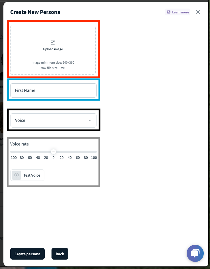 Voice rate & test [grey rectangle]- Sets the choice rate and enable to test the voice before creating the persona