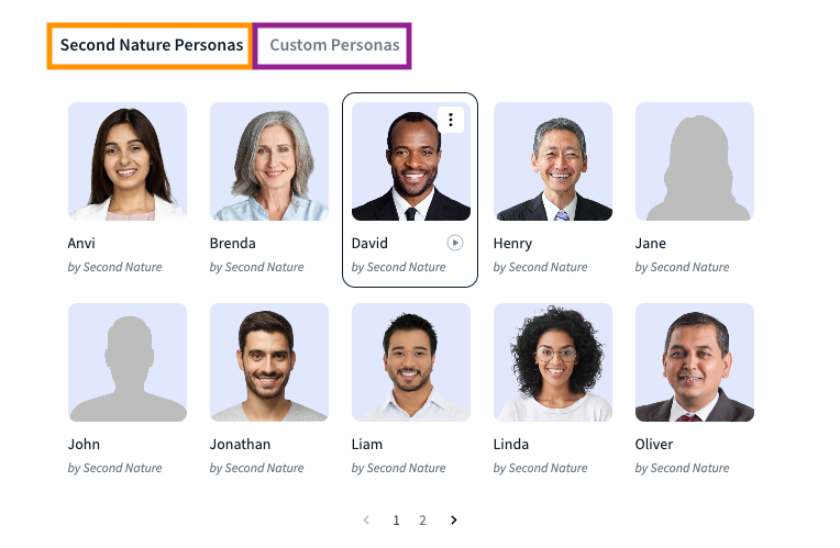 A preview of the AI Persona will be visible with two tabs: Second Nature Personas [orange rectangle] and Custom Personas [purple rectangle]. Second Nature Personas are a set of pre-defined default personas.