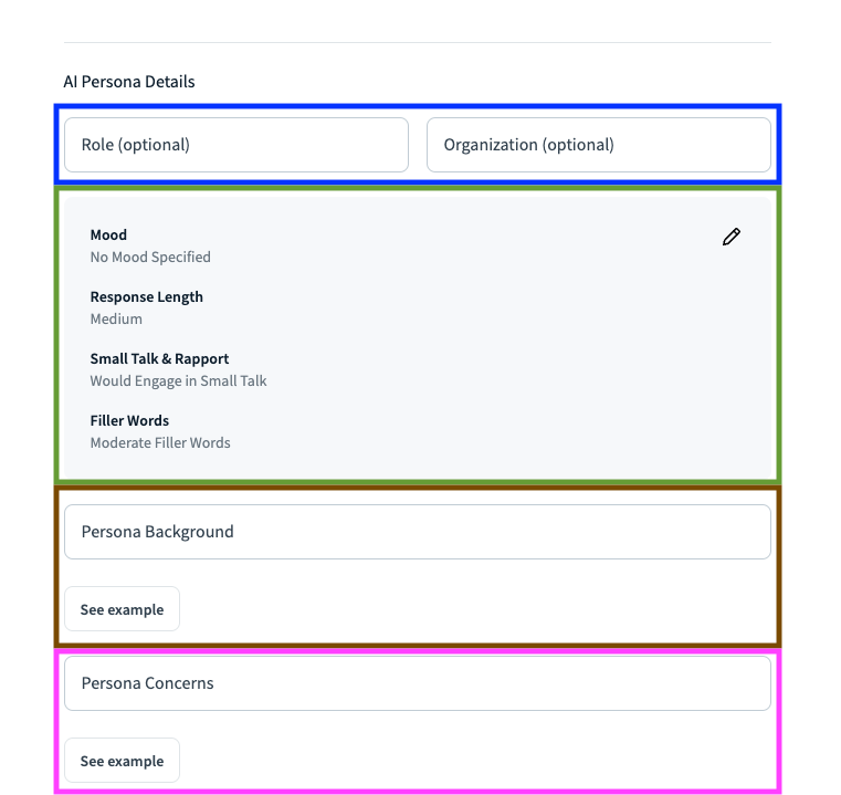 Persona background [brown rectangle]- Sets the background of the persona. This information will help contextualize the simulation and will provide meaningful inputs to make the simulation as realistic as possible. Background can be the AI persona, previous work experience, attitude, etc. You can see an example of a persona background prompt in the "See example" box.