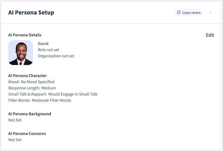 If you are getting ready for a real call, you may wish to adjust the AI persona name, role and organization to match the call.