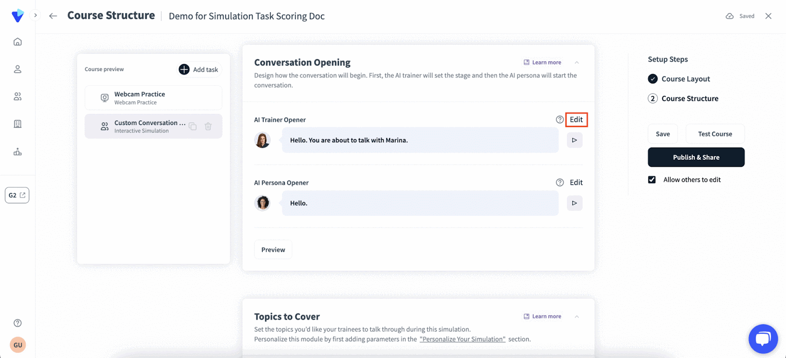 Click Edit next to the AI Trainer Opener and/or AI Persona Opener fields to set the opening lines. Press Done when you are satisfied with the text change.