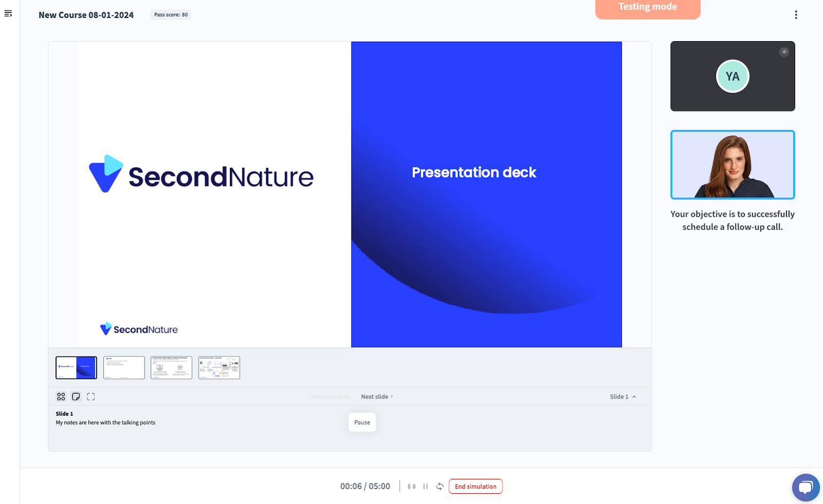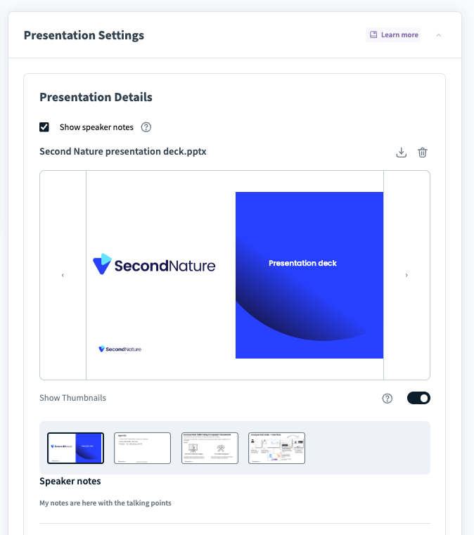 Screenshot below depicts an additional show speaker notes option available for simulations with an uploaded PPT/PDF:
