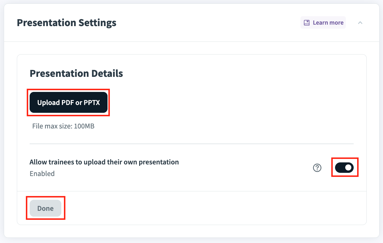 b. Toggle Allow trainees to upload their own presentation if you would like the trainee to have the option to upload their own presentation for their simulation.