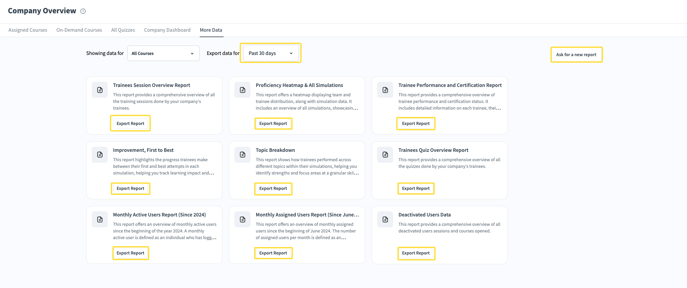 Proficiency Heatmap & All Simulations: This report offers a heatmap displaying company and trainee distribution, along with simulation data. It includes an overview of all simulations, showcasing passed and available simulations, sessions completed by trainees, and their best scores. Additionally, the proficiency heatmap reveals the highest scores achieved by each trainee in various courses.