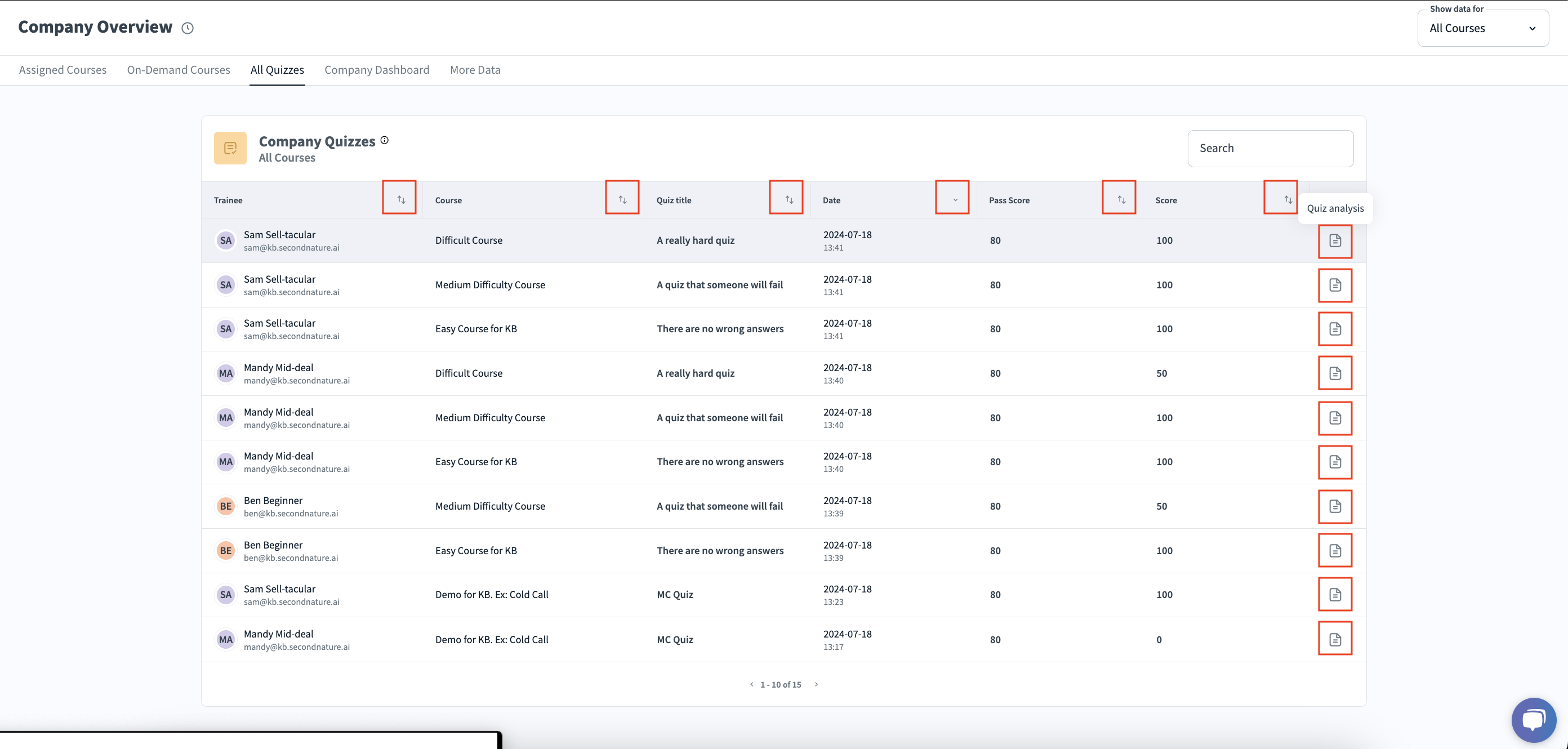 The Company Overview > All Quizzes page provides a table with all records of quizzes completed by trainees within your org. There are two actions available on this page.