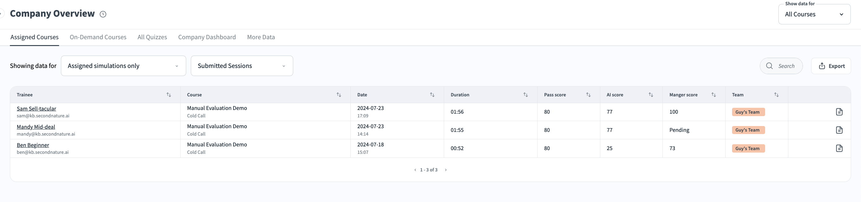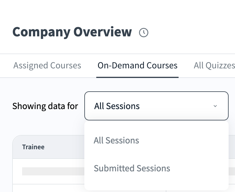 Within the Company Overview > Assigned Courses section, there is information on your company's session performance of only the courses that they were assigned to.