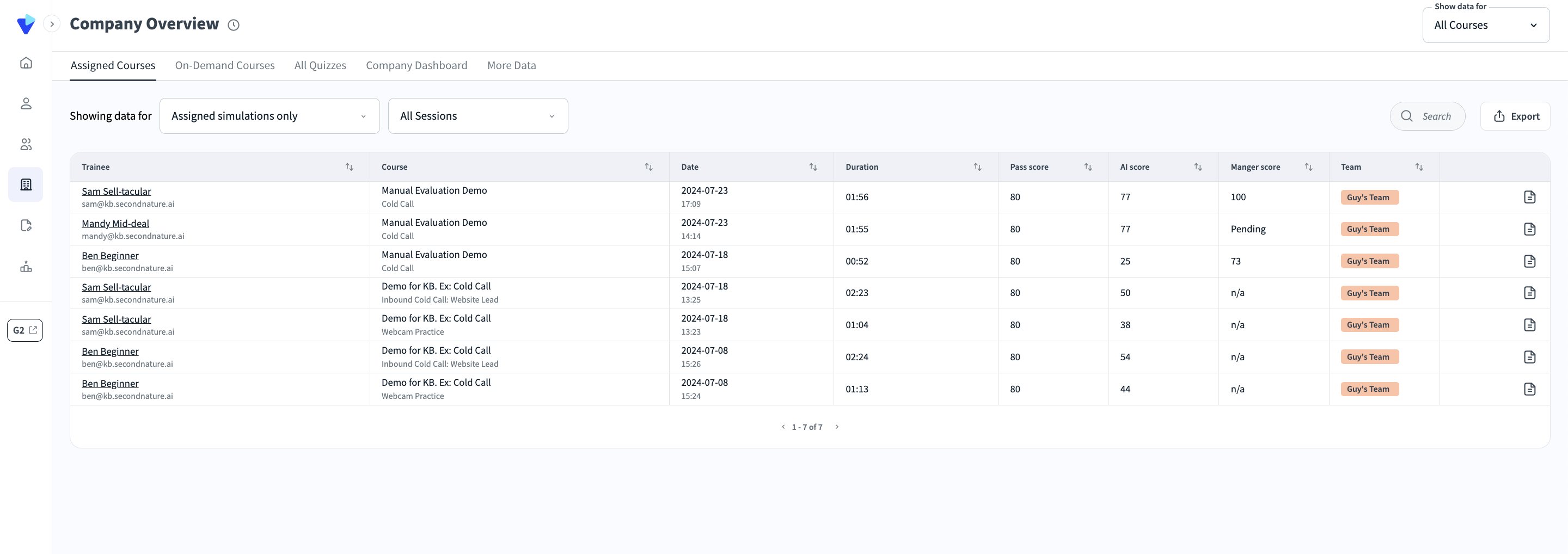 The Company Overview > Assigned Courses page provides a table with all records of sessions completed by trainees within your company.