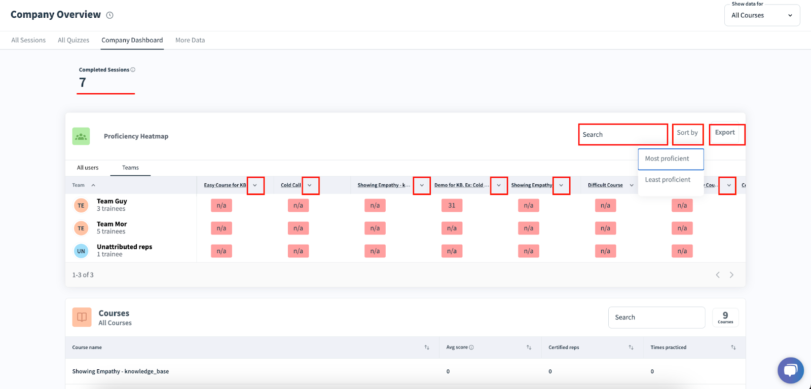 Below the heatmap table there is another table with an overview of performance on all courses. Alongside each course available within the org, there is an average score (of all users who completed the course), the number of certified reps (users who passed the course) and number of times practiced.
