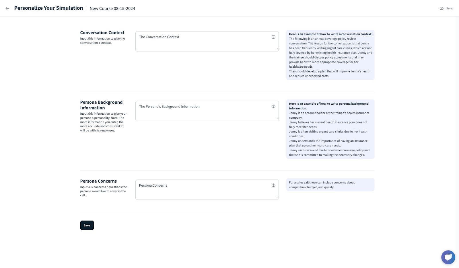 Three examples for the "Personalize Your Simulation" section for Conversation 2.0 are provided below to provide more clarity.